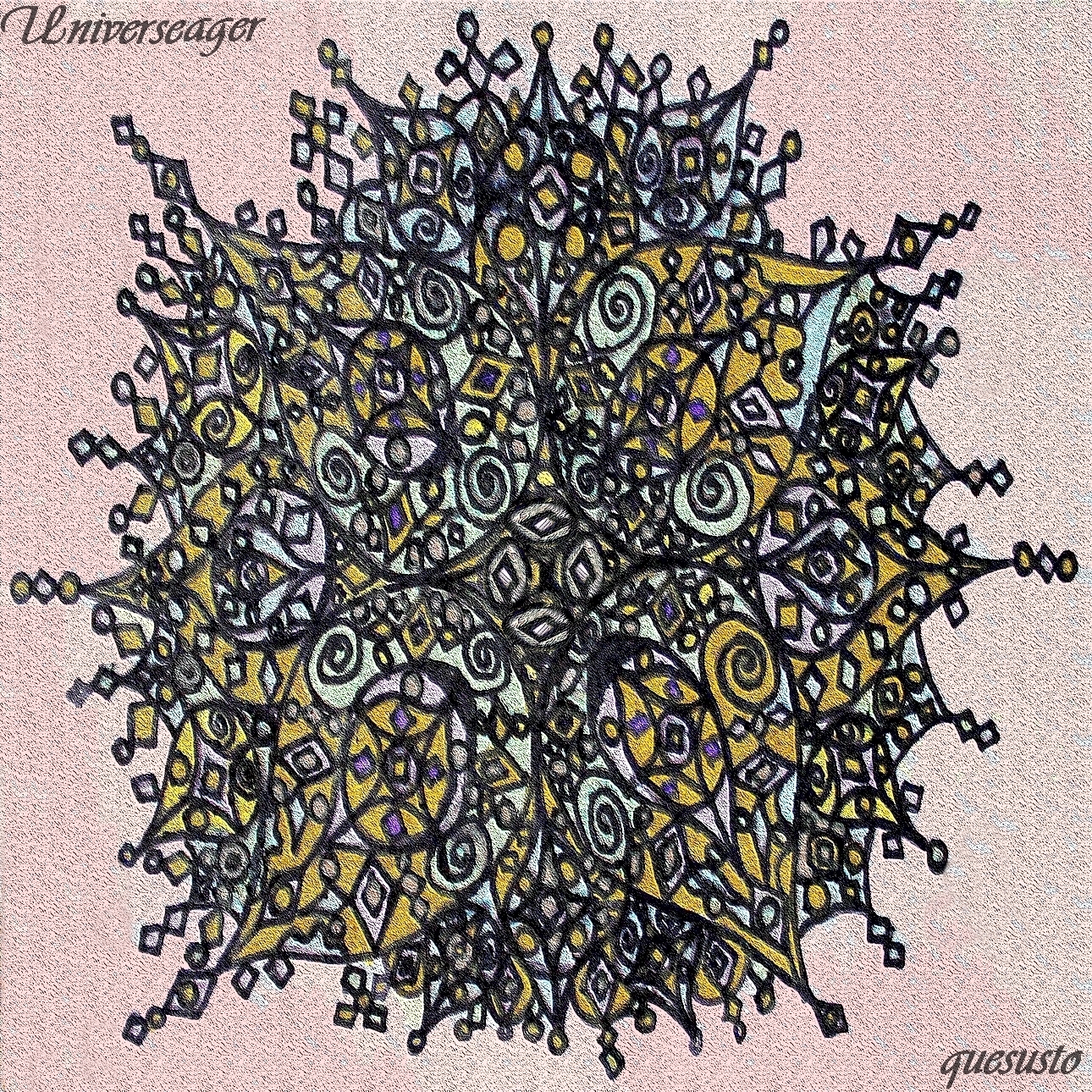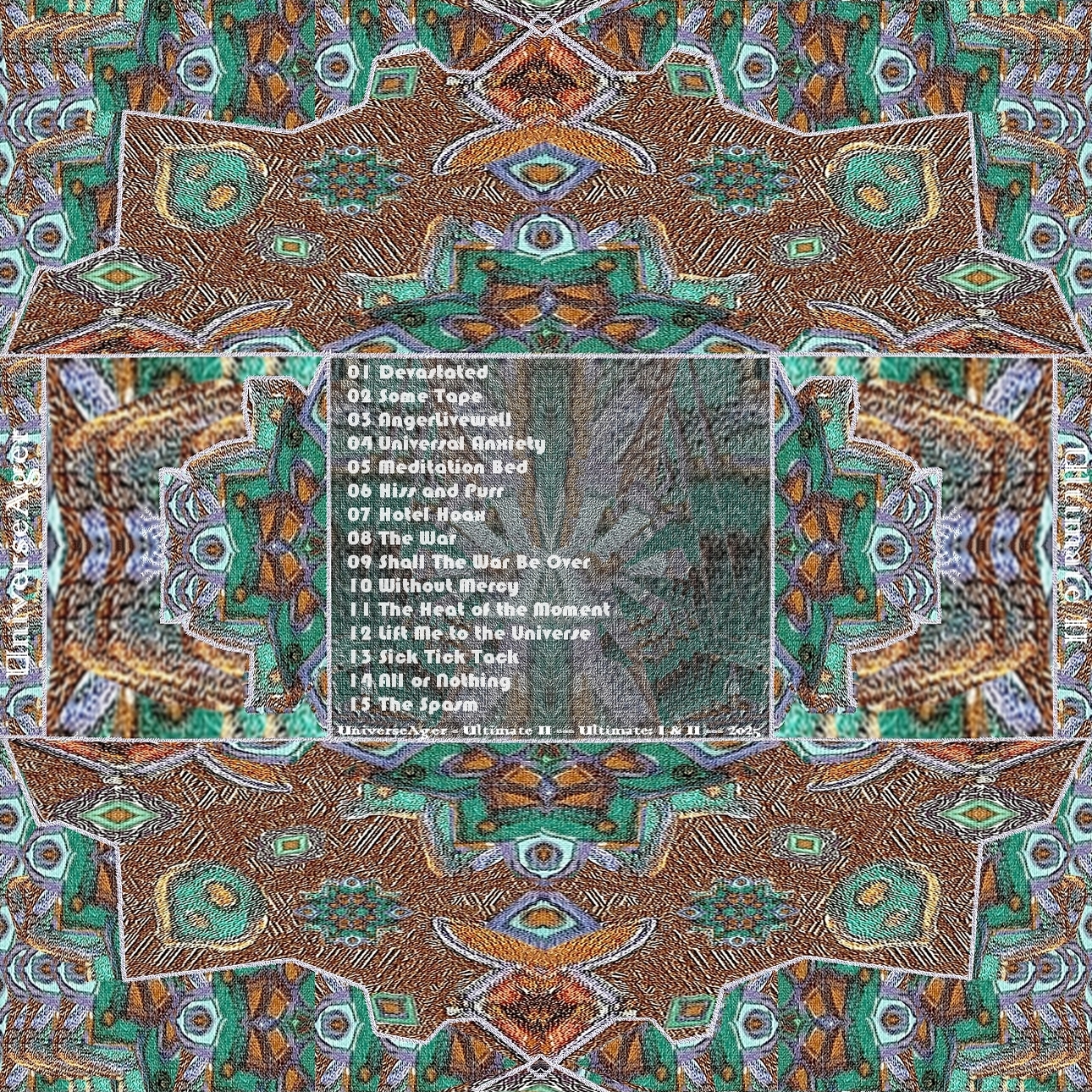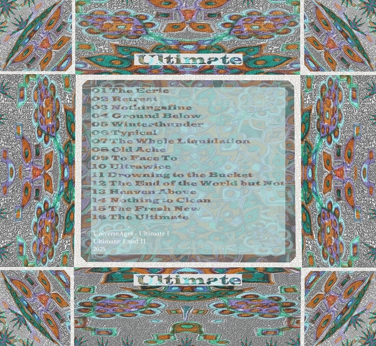 instrumentaalista vaihtoehtomusiikkia. Musiikkiani voisi ehkä myös kutsua trancecoreksi. UniverseAger on jatkoa edelliselle konemusiikkiprojektilleni, jonka alkuperäinen nimi oli \_ ja jota aloin lopussa kutsua Whatashockiksi, mutta jonka nimi tuli vielä vaihtumaan uudemmankin kerran UniverseAgeriksi. Olen kirjoittanut nimen aiemmin asuun Universeager, mutta mielestäni projektin nimellä tai sen kirjoitusasulla ei ole niinkään väliä, vaan enemmänkin sisällöllä. Halusin uudistaa projektiani helpommin lähestyttävämmäksi ja muodostin sen uudelleen uusin ideoin, jakaen sen kahteen osaan: vanhaan (\_) ja uuteen (UniverseAger). Kuten totesin, koen että nimi on lähes merkityksetön ja se voi vielä jopa muuttua. Levyjäni ja biisejäni voi kutsua nimeltä tai ilman. Nimenmuutokset tapahtuivat myöskin siksi että UniverseAger nimenä tuntui raikkaammalle. Teen musiikkia pääasiassa 'vahingossa' eli kun alan tekemään musiikkia en välttämättä mieti tai linjaa mitään erityistä, useimmiten en linjaa mitään. Varsinkin ilman linjauksia syntyy jostain syystä eniten kappaleita joissa kuulostaa olevan hämmästyttävänkin paljon vaikutteita, mutta tahalliset vaikutteet ovat hyvin harvassa musiikissani. Uskoisin vaikutteiden tulevan tiedostamattomina alitajunnastani ja pidän itse sitä mielenkiintoisena luovuuden ilmiönä. Vaikutteistani ja musiikkiprojektini vanhemmasta osasta voi lukea tarkemmin täällä. Musiikkini on tehty LMMS- ja Audacity -ohjelmilla ilman rahallista korvausta eikä musiikkiprojekteistani todennäköisesti koskaan tule kaupallisia. En aio jakaa musiikkiani muualla kuin korkeintaan tällä kotisivullani. Olen lisäksi nykyisin päättänyt julkaista musiikkiani vain yksityisesti, joten tälle sivulle ei enää tule jatkossa kuuntelumahdollisuutta, vaan poistin musiikkini täältä, koska julkaisu ei enää tuntunut mielekkäälle. Musiikkiani pääsee kuuntelemaan jatkossa vain kaverini. Jos olet kiinnostunut musiikistani ja hyvin aikein liikkeellä voit kysyä musiikkiani minulta mailitse. Musiikkini on tarkoitettu kuunneltavaksi kotikäyttöön. Musiikillani on minun puolestani lähinnä aina niin kutsuttu CC0-lisenssi. Voit kysyä kuitenkin luvan jos aiot varsinkin julkaista sitä jossain. Vaikka musiikillani on kyseisenoloinen lisenssi niin en toki myöskään kehoita musiikkiani varastettavan tai käytettävän muulla väärällä tai epäsopivalla tavalla. Pidän CC0-lisenssistä huolimatta yhä itseäni musiikkini tekijänä käytännössä enkä siten oikeuta muita omimaan tai varastamaan teoksiani jne. En kuitenkaan kannata tekijänoikeudellista kädenvääntöä enkä musiikkibisnestä, ja siksi tahtoisin jakaa musiikkiani aina ilmaiseksi ja hyvällä mielellä. Toivon sitä kunnioitettavan reilussa ja rennossa hengessä, maalaisjärjen nimissä. Kansitaide on käsialaani musiikin ohella ja kansitaiteeseeni halusin tuoda mandalan kaltaista taidetta joka olisi sekä musiikkiani kuvaavaa että jotakin siitä myös poikkeavaa. Ajatuksena on että siinä on pientä ristiriitaa musiikin ja taiteen välillä siten että kenties parantavaksi tai kauniiksi tarkoitettu mandalakuva lohduttaa jos musiikkini on liikaa korville. Nämä mandalat kertovat luonnosta, harmoniasta ja kauneudesta, eikä niillä ole muuta ideologista sanomaa. Ne ovat terapiamielessä piirrettyjä mandalakuvia levyn teemoihin viitaten. Musiikissani ei toistaiseksi ole sanoituksia eikä laulua. Levyilläni on nimet mutta vanhemmilla kappaleillani ei ole toistaiseksi nimiä, vaan vanhempien levyjeni kappaleilla on numerojärjestys sekä levyn nimi; jokainen kappaleista edustaa levyn nimeä ja teemaa kokonaisuutena. Olen tehnyt ja julkaissut nämä ja edeltävän musiikkiprojektini levyt huvin vuoksi enkä ole tarkoittanut näitä otettavaksi liian vakavasti, vaikkakin varsinkin nykyisin jo panostan enemmän musiikkiini. Esillä olevat levyt kappaleineen ovat lähinnä tarkoitettu demoiksi, joista voin myöhemmin tehdä edistyneempiä versioita. Teen silloin tällöin tälle sivulle levyistäni myös bonuksia ja miksauksia. Olen tehnyt tähän mennessä seuraavat levyt UniverseAger -projektilla: Nonpro, Vivalaviva, Nuances, Citadel, Quesusto, Waves, Radius, Shine, Absolution, Universeager, Torus ja -Clouds-, joista viimeksi mainittu on uusin. Julkaisen musiikkia pöytälaatikosta sitä mukaa kun sitä valmistuu, ja näiden levyjen julkaisuvuosi onkin tälle erää kaikissa sama eli 2023-2024. Vuonna 2025 valmistui Ultimate (osa I ja II). Siitä seuraavan levyn vuonna 2026 nimeksi olen päättänyt jo MeditationMetal. Tämän jälkeen ajattelin julkaista vielä yden levyn tällä projektillani vuoden 2028 paikkeilla, jonka jälkeen tämä projektini jää paussille, kehitysideoinnin alle. UniverseAger -nimisen projektini uudemmalla puoliskolla Shine- levyyn saakka kappaleeni ovat nimettömiä. Absolution -levyltä eteenpäin aloitin kappaleiden nimeämisen erikseen, mutta musiikki pysyi edelleen instrumentaalisena. Musiikkityyli on hioutunut ja tullut osin raskaammaksi uusimmilla levyillä, joten ne lienevät kaikkein laadukkaimpia, jos laatua näistä joku etsii. Uusimmillakin levyilläni olen jättänyt musiikkini vielä melko rosoiseksi, säriseväksi ja rahisevaksi, jäljitellen demo-, live- ja vinyylisoundia. Tämän olen pitänyt vielä tunnuspiirteenä musiikinteossani. Se on toki hienoinen kannanotto ja ehkä myös suojausta mahdollisia musiikkivarkaita vastaan. Aiempaa projektiani \_:aa eli kenovivalavivaa voi kutsua nimellä UniverseAger, koska tulen tarvittaessa esittämään ne saman nimen alla. Kirjoitin aiemmin projektini nimen useassa muodossa, mutta nykyinen vakiintui kirjoitusasuksi. Tällä sivulla kahdeksan ensimmäistä levyäni on julkaistu alun perin hieman eri nimillä, mutta ne ovat kuitenkin sama UniverseAger. Mitä UniverseAger tai Intoversumi tarkoittaa? Se on vertauskuva jossa on monta aspektia, mutta pääasiallisimpana seikkana se tarkoittaa univers